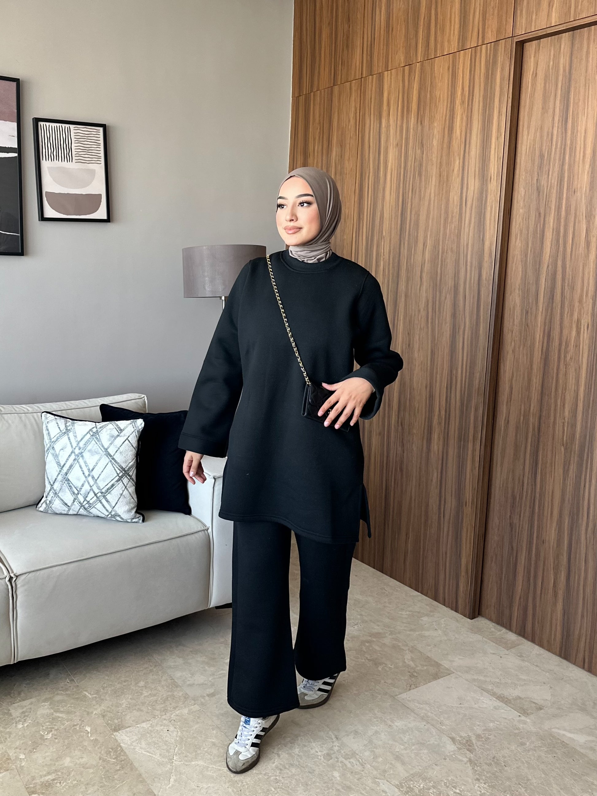 Composé d’un haut oversize long et d’un pantalon large fluide, cet ensemble offre un look moderne, minimaliste et parfaitement adapté au style modeste.